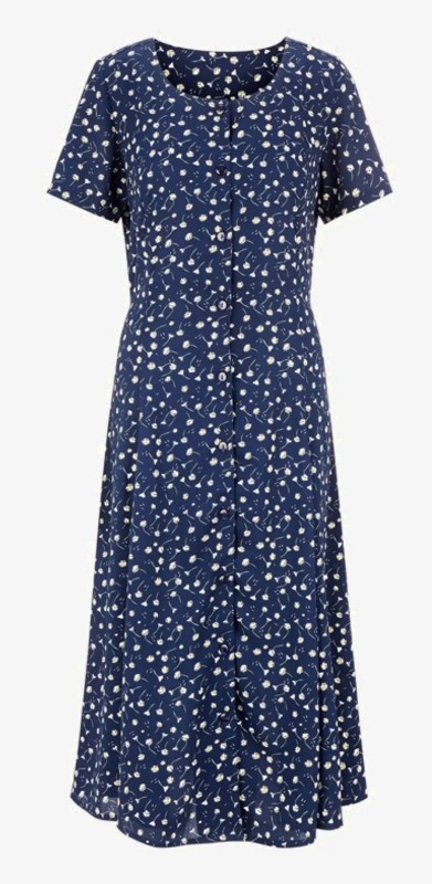 Vzdušne ľahké šaty na teplé letné dni. S pôvabným kvetinovým vzorom. Vpredu s gombíkovou lištou po celej dĺžke. S úzkymi viazacími páskami na chrbte, ktorými môžete upravovať šírku v páse. S tvarujúcimi švami. Nekrčivá látka mimoriadne nenáročná na udržiavanie.