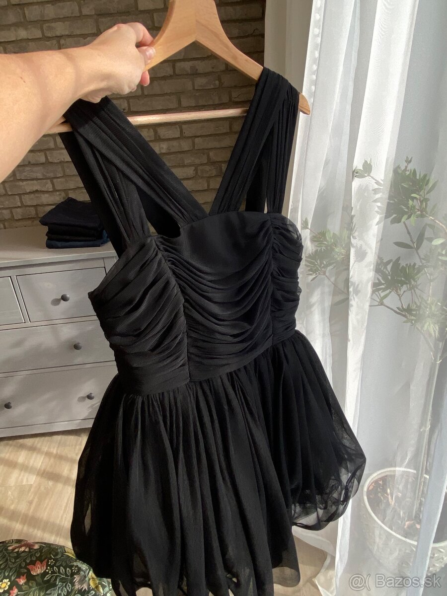 Predávam čierne šaty v štýle tutu - šaty majú bohatú tylovú sukňu. Šaty sú krátke cca do polovice stehien. Pod šaty sa dá pohodlne obliecť podprsenka - ramienka nie je vidieť. Šaty sa zapínajú na boku. Vrchný diel je nariasený. Veľkosť 12 - teda 40 - no lepšie sedia na postavu velkost 38. Šaty v celej dĺžke kvalitne podšité saténom a prijemne sa nosia - oblečené boli iba raz.