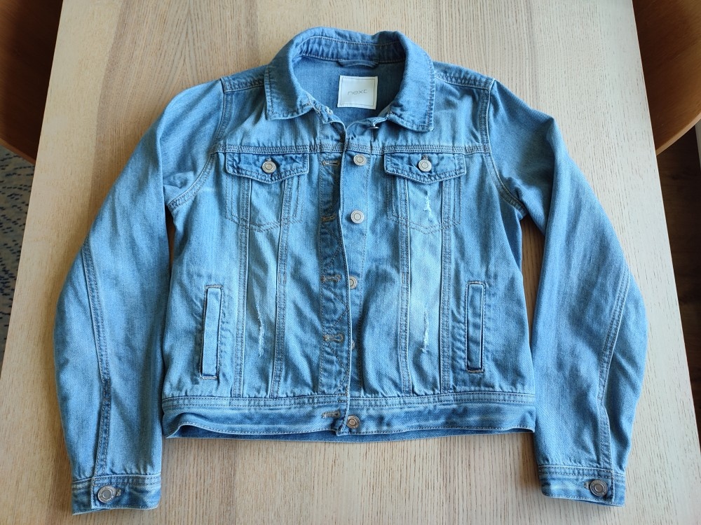 bunda kúpená nová a príležitostne nosená dcérou, je bez akýchkoľvek poškodení. veľkosť 146 ale vydrží dlhšie. krásna a kvalitná, super strih, riflovina je mäkučká.