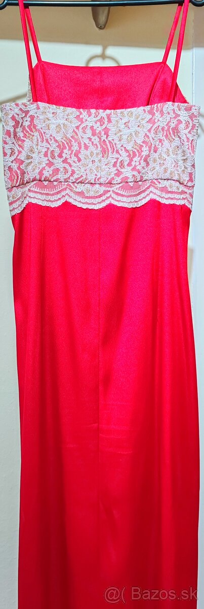 Predám dlhé spoločenské satenove šaty červenej farby site na mieru. Rozparok na boku, cez prsia zlata krajka plus bolerko rovnakého vzoru.Sedi na veľkosť S/M.