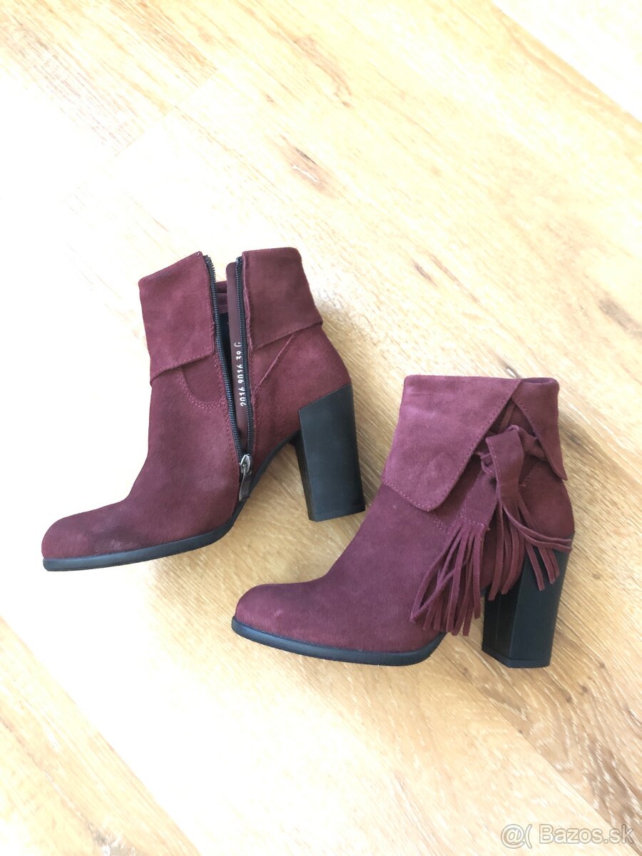 Predám úplne nové kvalitné čižmičky z brusenej kože vel.39, značka SIMEA, bordová farba, vnútri zateplené, opätok 8 cm. Po operácii nohy ich žiaľ neobujem. PC 85€.