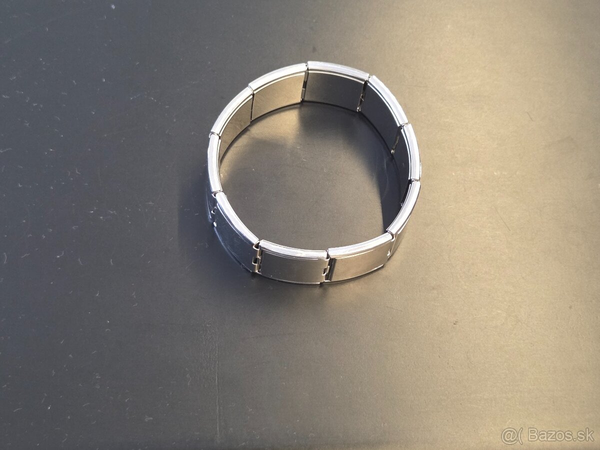 Predám masívnejší náramok z chirurgickej ocele. Je veľmi praktický – je na pružinkách (naťahovací), takže nemá žiadne zapínanie, ktoré by sa mohlo pokaziť a ľahko sa dáva na ruku.