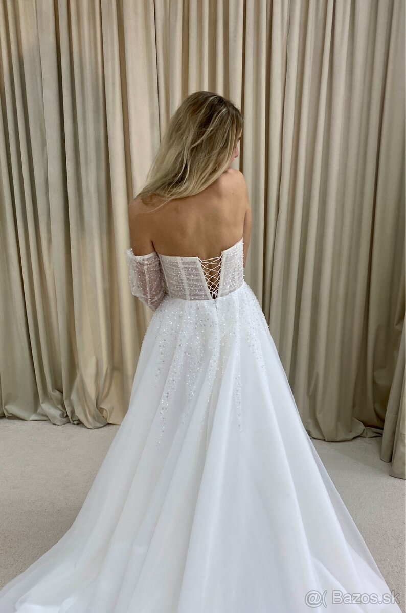 Predám nádherné svadobné šaty, šité na mieru. Vhodné pre postavy XS-M, dĺžka šiat na výšku cca 164cm plus 6cm opätok. Som prvá majiteľka, sú profesionálne vyčistené, bez chyby. Predávam ich aj s rukavikmi a dlhým závojom. Dohoda na cene možná.