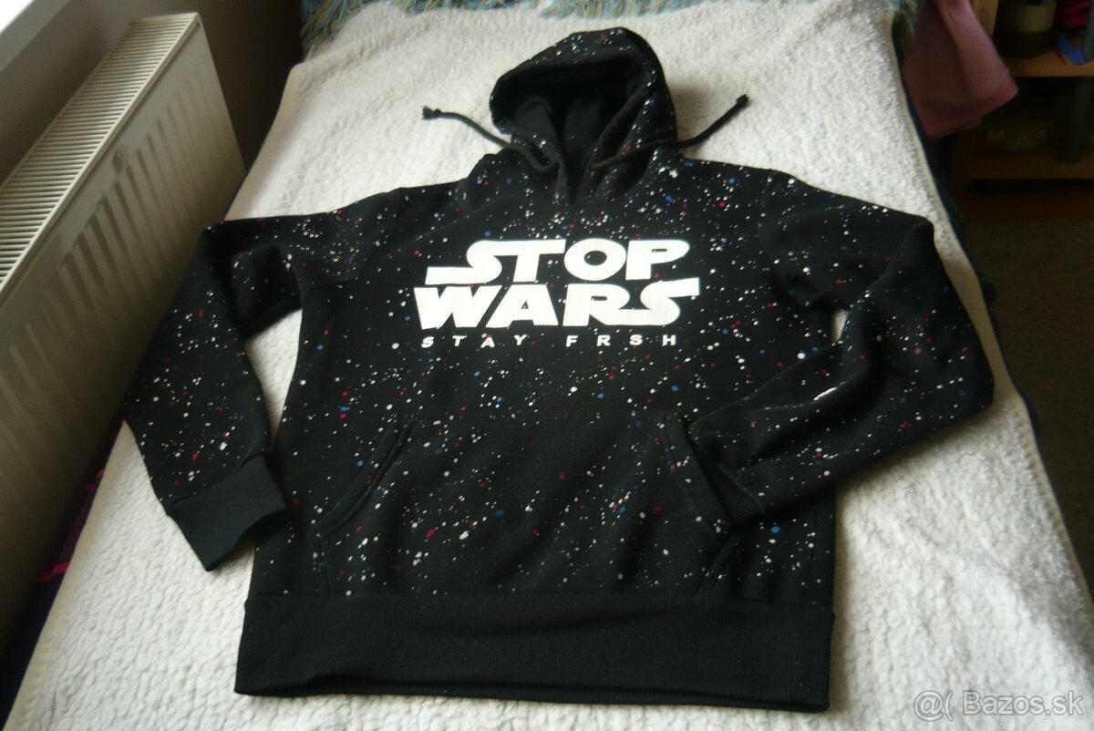 pánska mikina čierna s kapucou, č. S , s nápisom Stop Wars, cez prsia 53cm, dĺžka 63cm. Cena 6 eur.