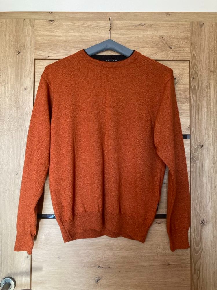 Vlneny sveter znacky Kitaro v krasnej tehlovooranzovej farbe. Made in Italy. Zlozenie 50%vlna a 50% akryl. Sirka pod pazuchami 54cm, dlzka 64cm a dlzka rukava od ramena 61cm. Sveter nema ziadne znamky pouzivania. Sveter je oficialne z muzskej kolekcie ale podla mna je unisex a sedi dobre aj zenam. Osobny odber Poprad alebo posielam po prijati platby na ucet.