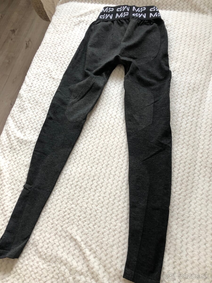 2x oblečené čierne legíny značky MyProtein vo veľkosti S. Logo po celom páse