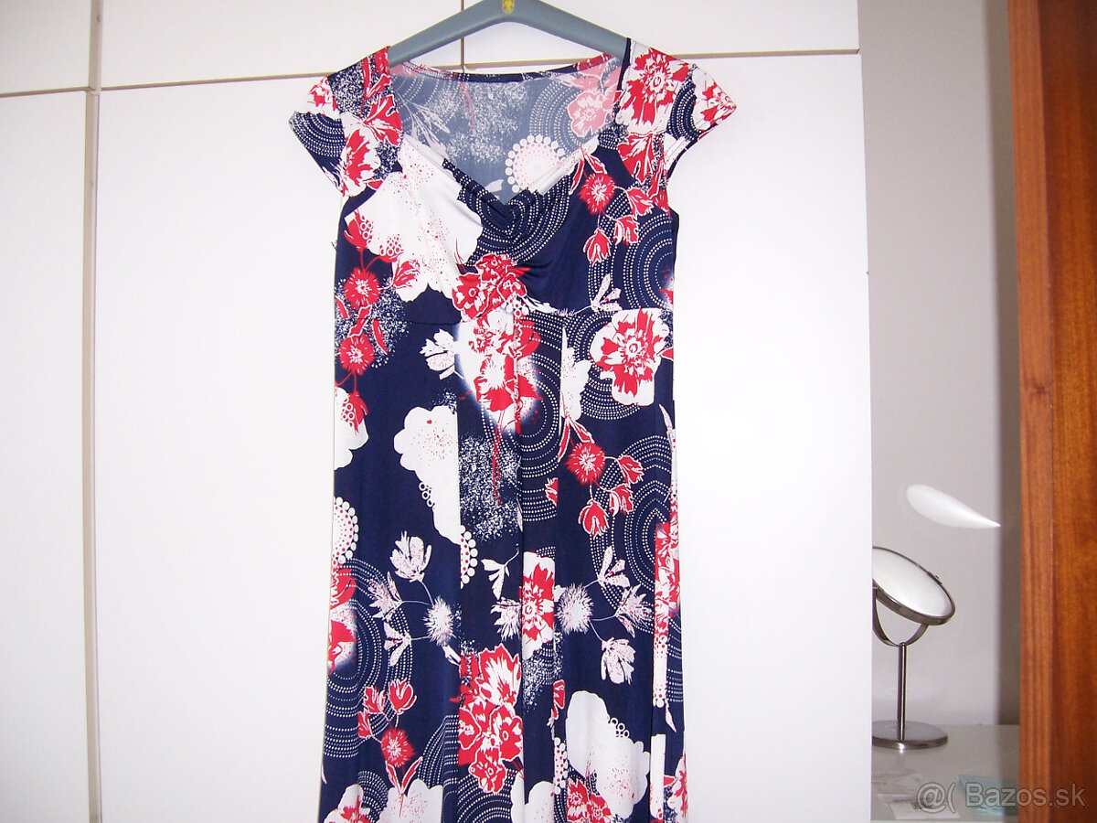 predám nové letné šaty, veľkosť L, padavá,mierne elastická látka,DL= 100cm,krátky rukáv,šírka pod prsami 44x2=88c,po roztiahnutí šírka pod prsami 53x2=106cm.Farba červena-modrá-biela