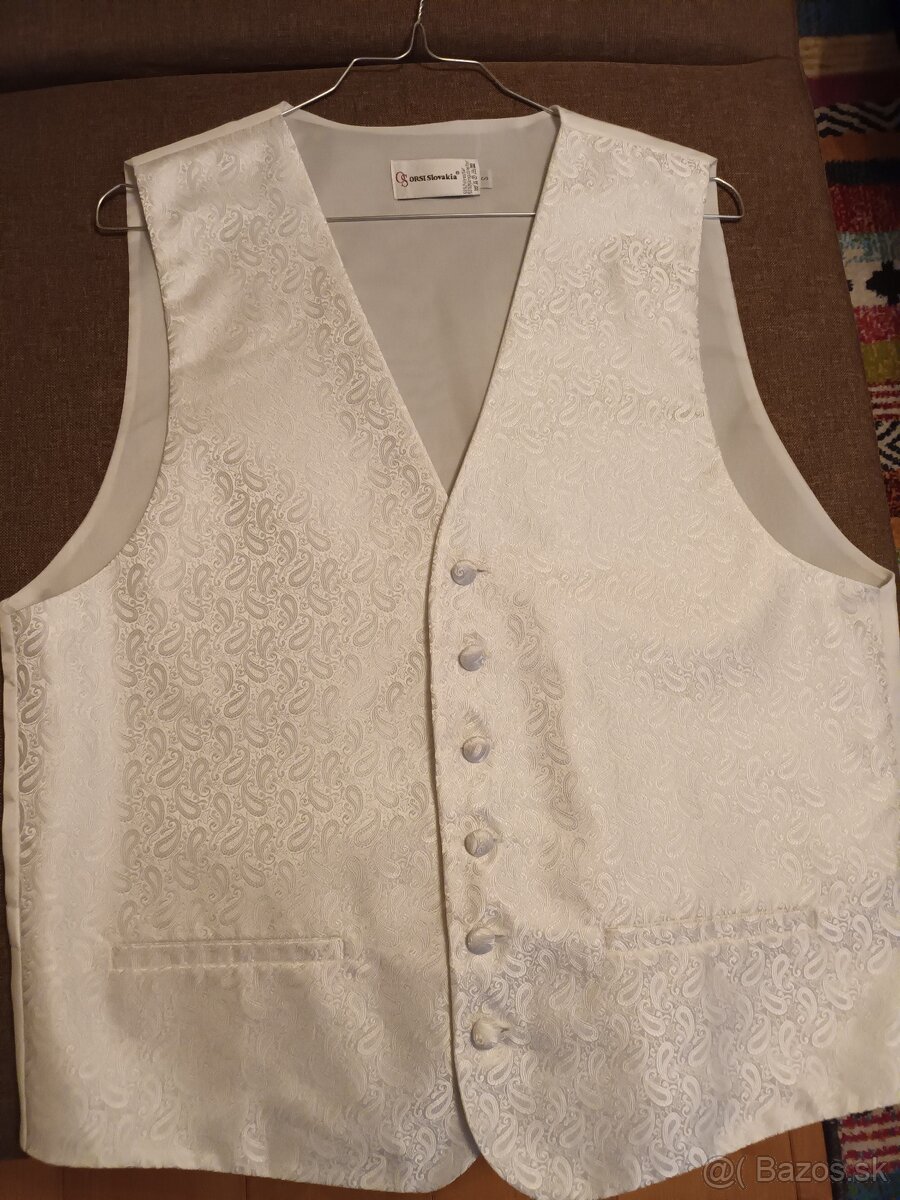 Ponúkam na predaj svadobnú vestičku veľkosť S, spolu s francúzskou kravatou, vreckovkou a manžetovými gombíkmi. Vesta bola profesionálne vyčistená.