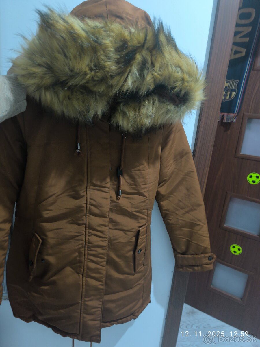 Veľkosť S-uplne nová,obojstranná,jedna strana hnedá,druhá nepremokavá modrá d odopinatelnou kapucňou.