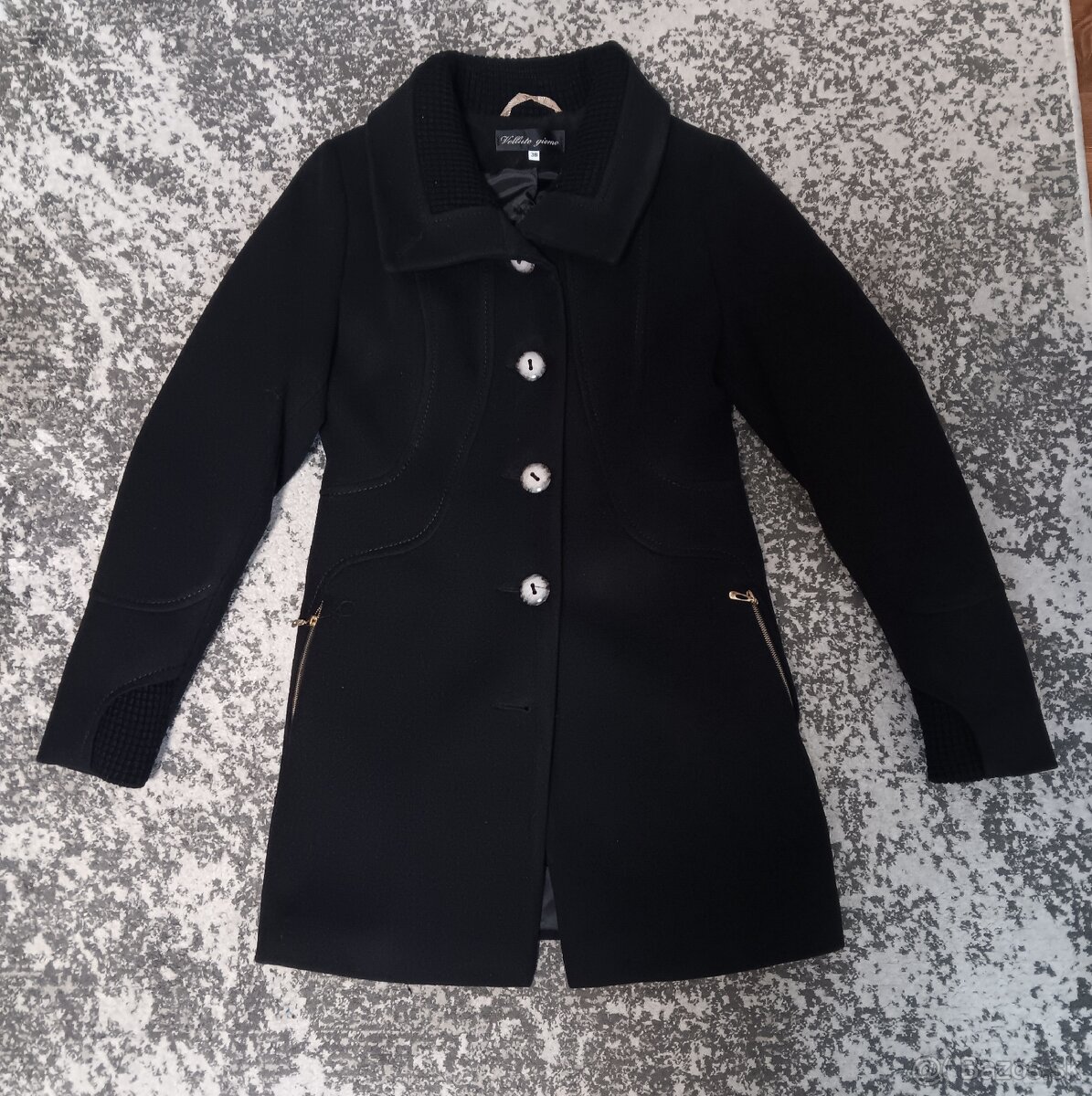 1. elegantný, čierny dámsky kabát, veľkosť S/M. Kapucňa je odnímateľná, s vačkami, na 5 gombíkov, s prackou na rukáve. Vhodný na prechodné obdobie jar/jeseň. Dĺžka je 75 cm, šírka v páse je 2 x 43 cm, dĺžka rukáva od ramena je 61 cm - 10 eur