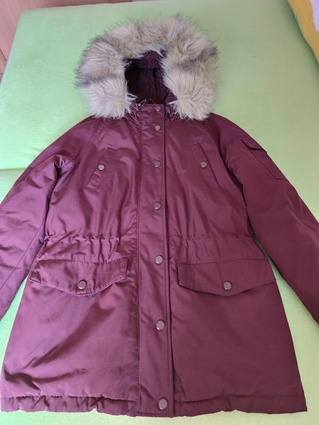 Predám málo používanú zimnú bundu. Je vatovaná a veľmi hrejivá, vhodná aj na silnejšie mrazy. Zapínanie je na zips a cvoky. Má 2 vrecká na ruky, 2 náprsné vrecká, 1 vrecko na rukáve, všetky sa zapínajú cvokom. Kožušinka na kapucni sa dá odopnúť. Okolo krku a v páse má sťahovanie. Farba je tmavšia bordová.
