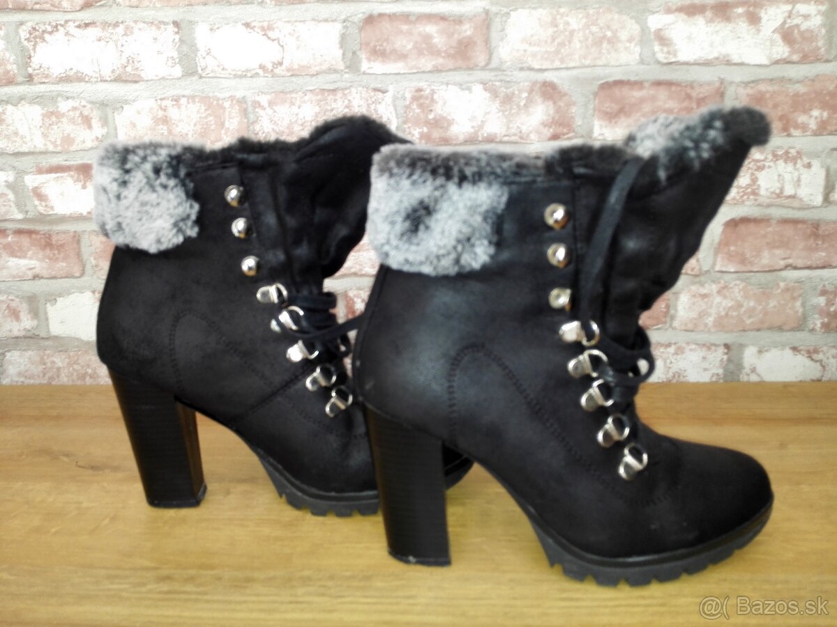 Predám raz obuté zateplené kotníkové topánky č. 38. Výška podpädku je 9cm, celková výška topánky je 20cm.