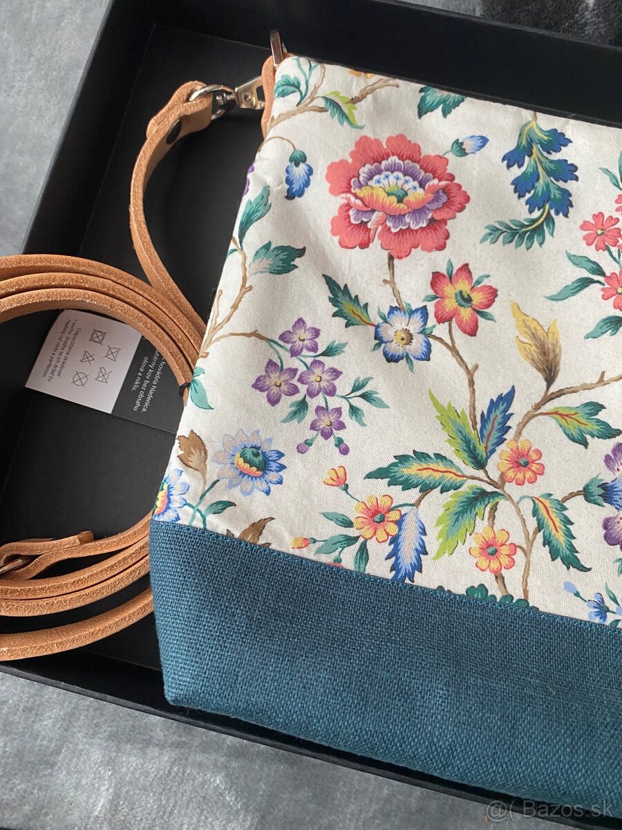 Nová, nepoužitá. Set obsahuje kabelku, šatku do vlasov, náramok a náušnice. Rozpredám aj po častiach. Materiál pravá koža a ľan. Slovenská výroba.