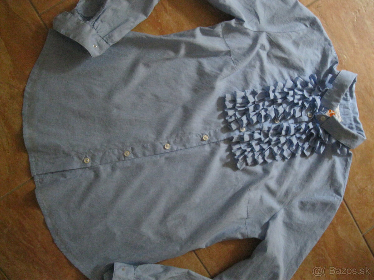 Predám dámsku modrú blúzku Hugo Boss, materiál 100%bavlna. Dĺžka od pliec 66cm, šírka pod paz. 49cm x2, šírka v páse 47cm x2.