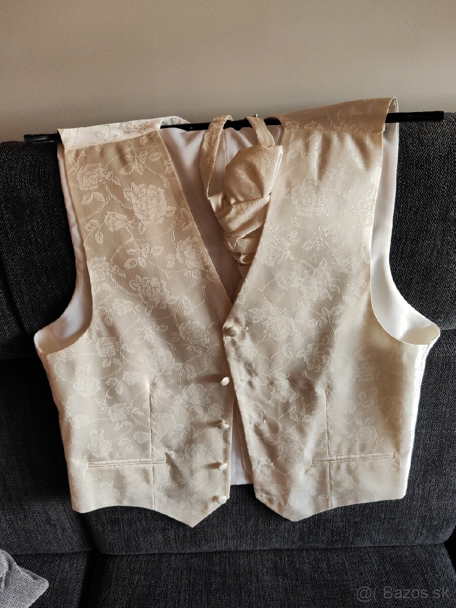 Pánska svadobná vesta - [16.3. 2026]Pánska svadobná vesta farby Ivory, vel.48, podsita, francúzska kravata, vreckovka do saká
