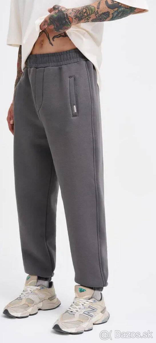 Voľnočasové tepláky JUST PLAY - [3.3. 2026]Predám pánske teplákové nohavice, vhodné na akúkoľvek outdoorovú aktivitu alebo športovú činnosť s bielym nápisom v oblasti stehna a čiernym patentom na oboch nohách.
