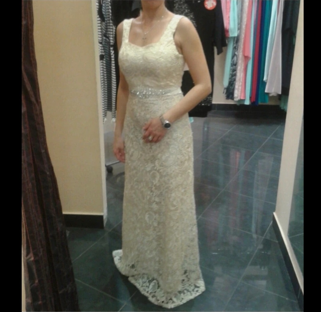 Predám spiločenské šaty smotanovej farby,velkosť S-M.Raz oblečené.