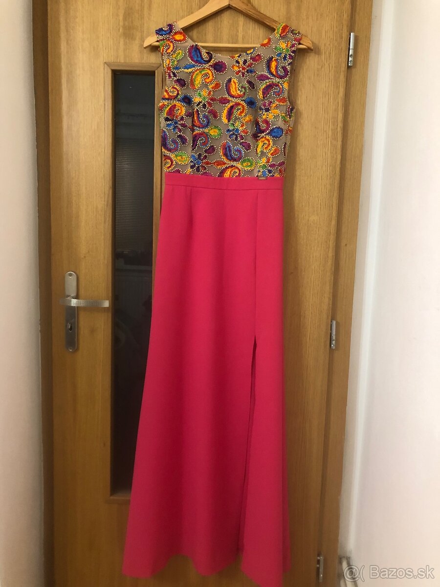 Dámske dlhé, spoločenské šaty s rozparkom vo veľkosti S. Pod šaty sa dá obliecť telová podprsenka, aby ju nebolo vidno. Oblečené 1x.