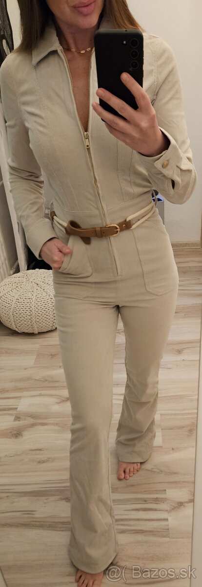 elastanom sedí perfektne,nohavice ma mierne do zvonu v spodnej casti,cena iba 18eur,v ponuke aj cokoladova vesta zateplena bezovou kozusinkou zapinanie na zips strih do pasa,vel.xs aj sedí cena 20eur