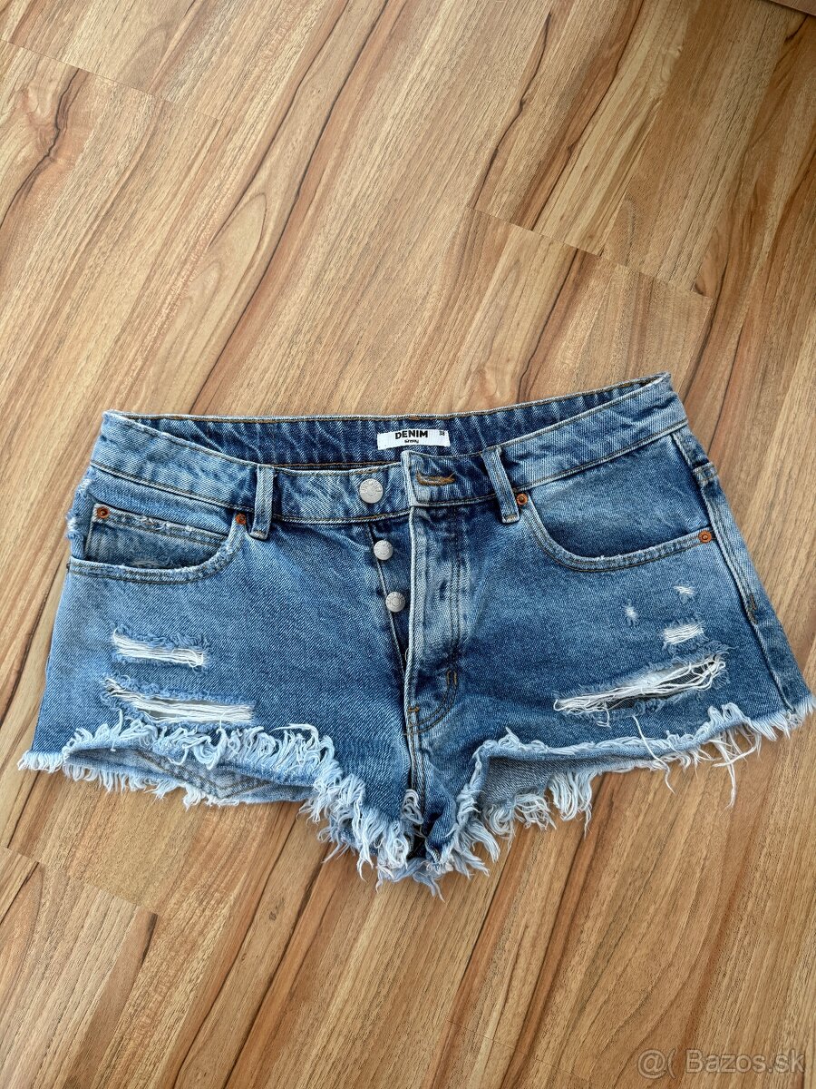 Riflove kraťasy - clockhouse - [22.3. 2026]Kraťasky na leto. Nosené, v dobrom stave - fotka. Veľkosť 38, Po prevode na účet s podacím lístkom na sledovanie zásielky. Poštovné 3.50 eur.