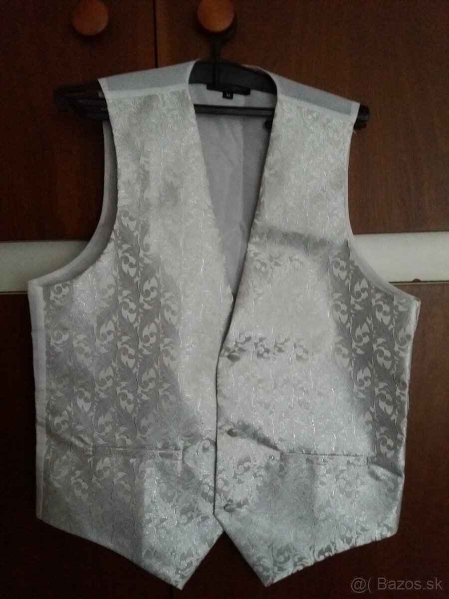 Predám luxusnú pánsku svadobnú striebornú vestu + kravata, použitú pár hodín, veľkosť M. Značka Romanno Mazzni. Okres Detva, len osobný odber, prosím píšte, číslo vymyslené.