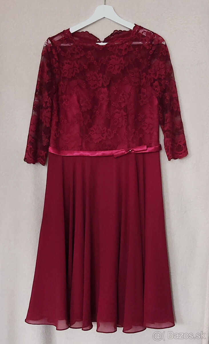 Celková dĺžka 105 cm, sukňa 62 cm, pás 82 cm, uvedená je veľ. 18 (42-44). Hore krajka, pod tým saténový korzet, sukňa mušelín, tiež so saténovou spodničkou. Krásne vypracované, pekne sedia na postave. Farba najlepšie zodpovedá tomu detailu sukne, je ešte o niečo tmavšia oproti fotke, taká vínová. Cena 60 €.