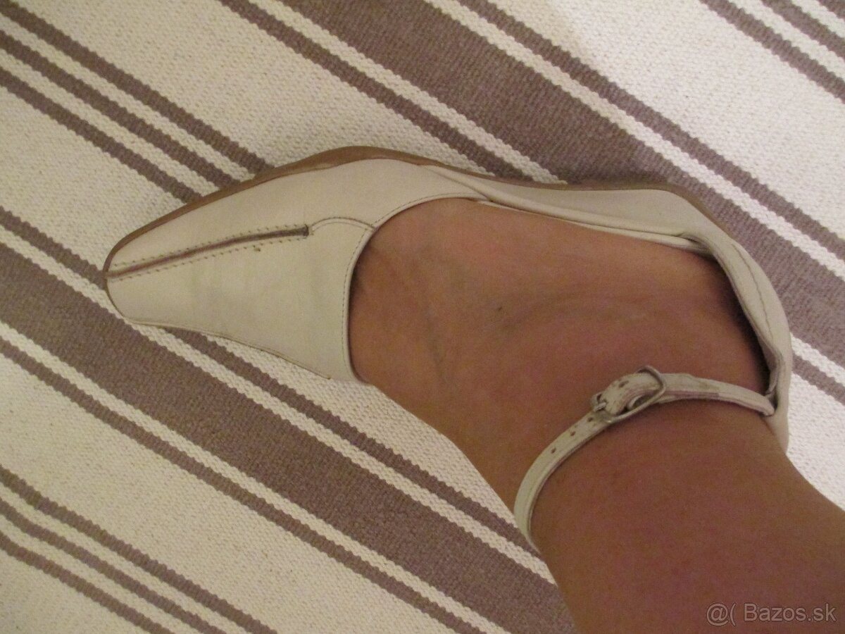 Spoločenské pohodlné topánky, aj na bežné nosenie, kožené,s plným podpätkom vysokým 6cm, béžovej farby. Veľkosť 39. Vnútorná dĺžka je 25 cm. Bez poškodenia.