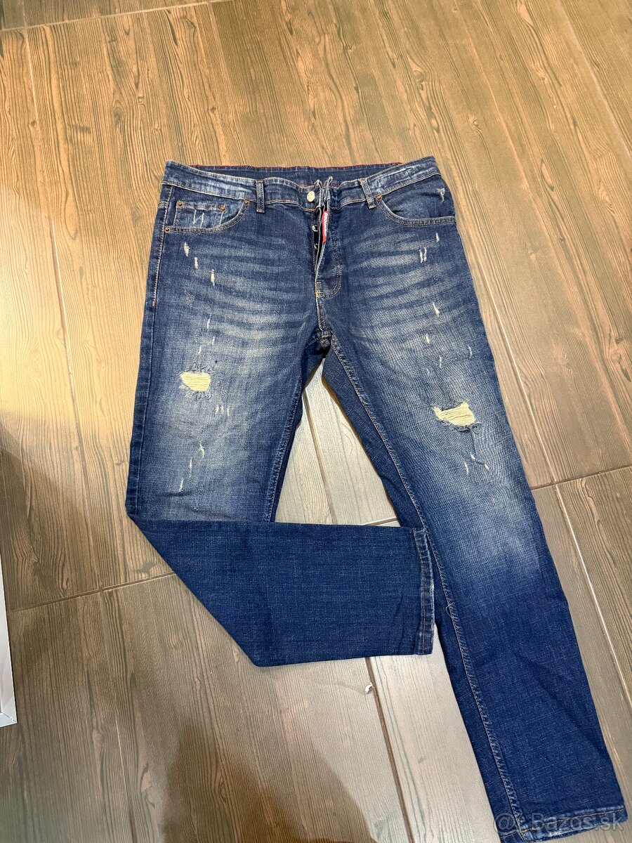 Pánske rifle - [21.3. 2026]Pánske rifle, nové, synovi sú malé. Veľkosť 34, rozmery sú na foto. Jemne elastické, podľa materiálu skôr zimné.