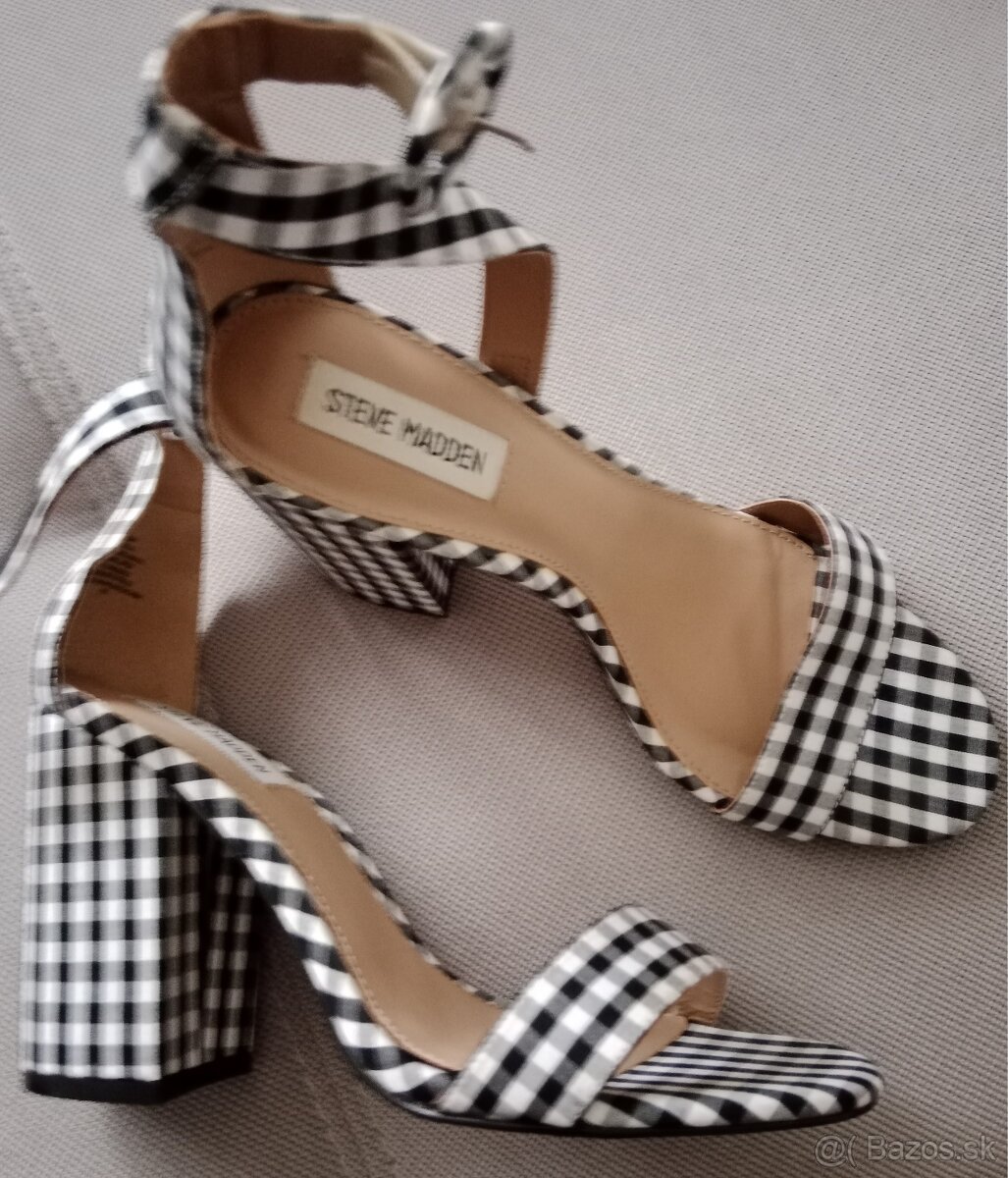 Predám dámske sandálky zn. STEVE MADDEN, veľkosť 40, opätok 10cm, materiál čierno-biela kockovaná látka, remienok okolo členka. Párkrát obuté, zachovalé. Cena 5€ + poštovné. Info na mail, nie sms.