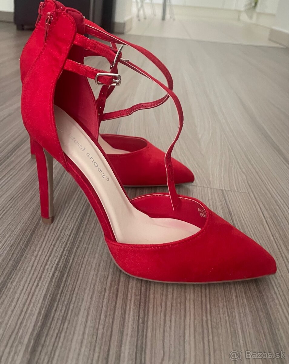 Elegantné červené lodičky č. 39 - [18.3. 2026]Predám minimálne použité (čo je vidieť aj na foto) dámske módne pohodlné, nazúvacie a univerzálne špicaté topánky s plytkým výrezom, s dizajnom štvorcovej pracky, hrubým podpätkom. Možnosť osobného odberu v Kalinkove pri Dunajskej Lužnej, resp. zaslania na dobierku.
