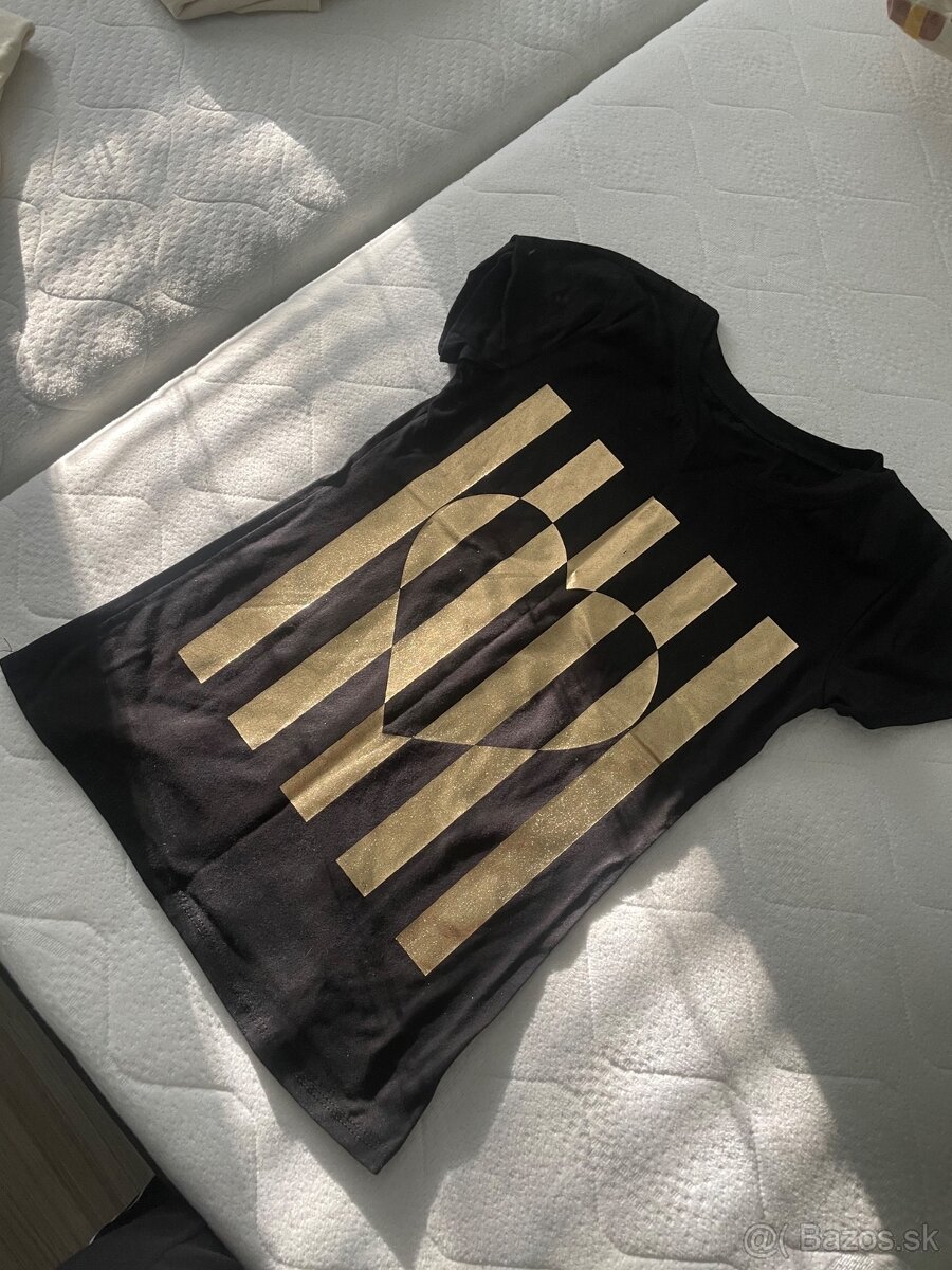 Predám nové nikdy nenosené veľmi pekné čierne tričko so zlatou potlačou, veľ.S (obtihnuté M), cena 5€+poštovné