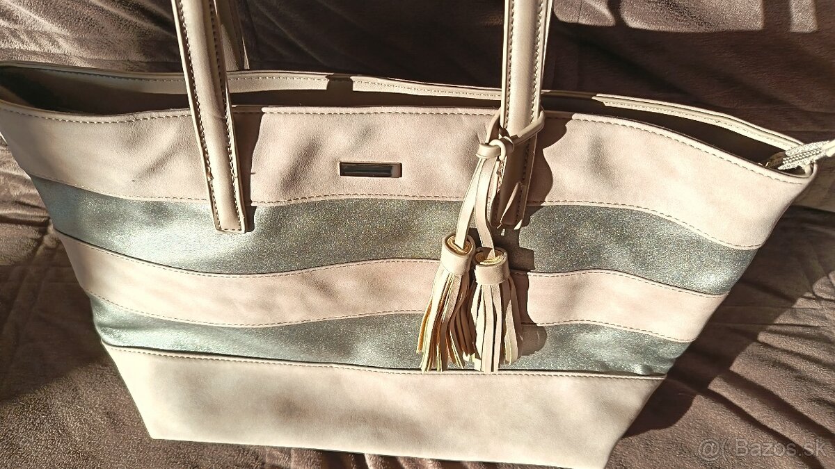 Predám úplne novú dámsku kabelku značky Lara Bags s visačkou. Je A4 formát. Ozdobný strapec je odnímateľný. Farba je cappuccino kombinovaná s lesklými metalickými pruhmi na prednej strane.
