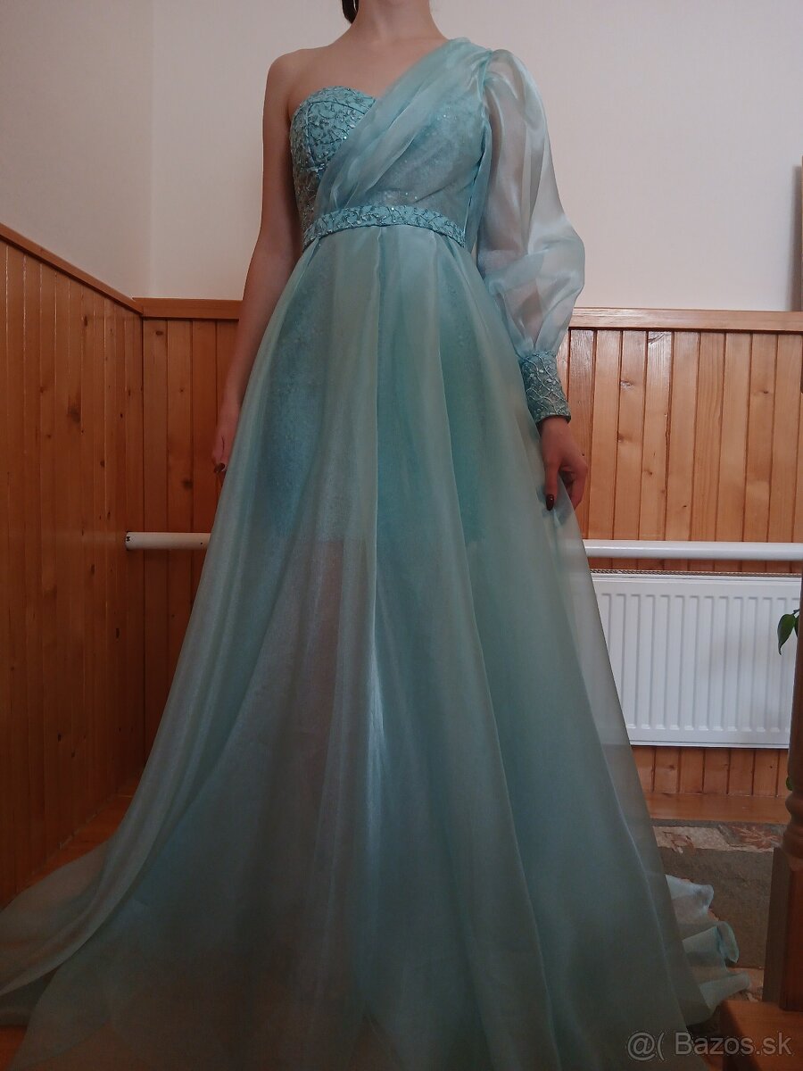 Predám dievčenské / dámske spoločenské šaty, v. 34. Šaty boli oblečené 1x aj to max. 4 hodiny. Farba krásna sv. tyrkysová. Šaty sú bez poškodenia. Kupované boli v obchode so spoločenskými šatami.