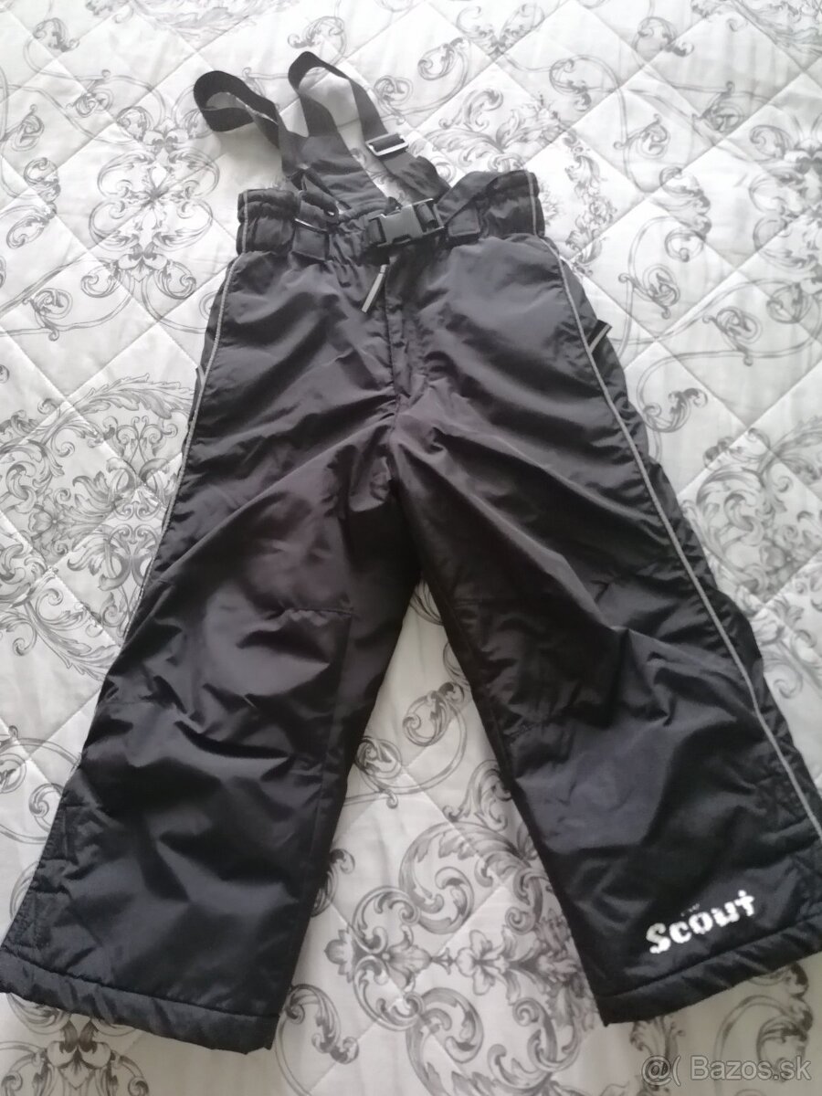 Kvalitné otepľovačky zn. Scout, veľkosť 104. Celková dĺžka od pása dole je 65cm, od rozkroku 41 cm. Pás na gumku, natiahne sa na max. 2x32cm, zapínanie vpredu na zips a cvok. Na bokoch sú vrecká na zips. Traky držia. Naspodu na suchý zips. Trošku ošúchané písmenká naspodu na nohavici, zvnútra boli podpísané. Bez poškodenia.