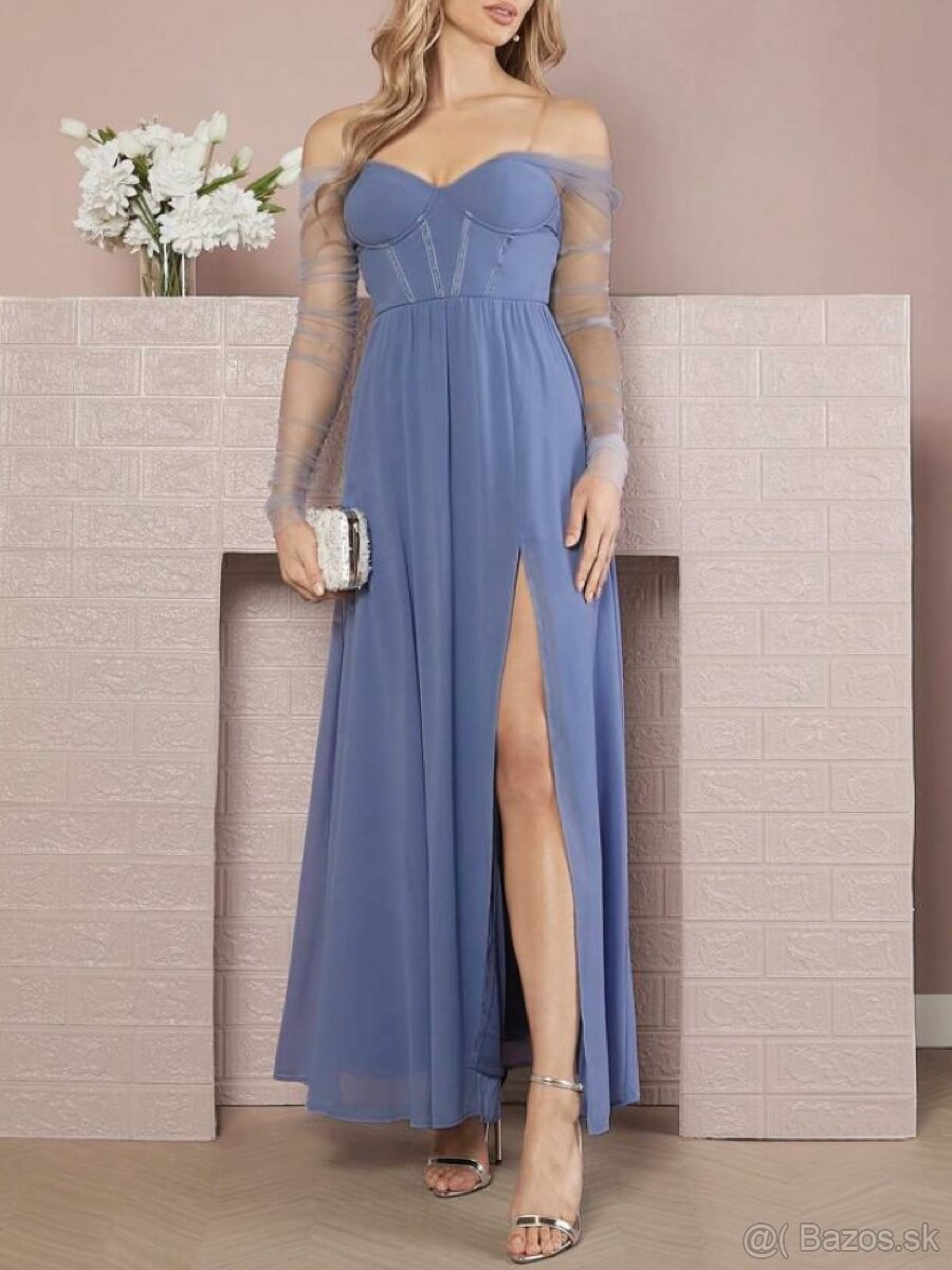 Nové dlhé spoločenské šaty s rozparkom v šedomodrej farbe. Vhodné na stužkovú, ples alebo svadbu. Veľkosť M.