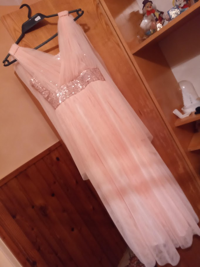 Krásne spoločenské šaty pre mladé dámy, len raz oblečené na svadbe, raz vyprané, ako nové. Jemná oranžová - broskyňová farba.