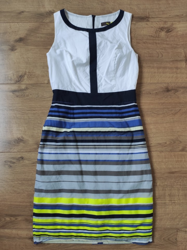 úžasné šaty, kvalitné, drahá značka, perfektne ušité. veľkosť písaná EU 40 ale sú o dosť menšie, nosím 38 a iba mi visia ako motivačné v skrini. sadnú na 36. materiálové zloženie na foto. oblečené boli raz, sú vyprané, stačí vyžehliť. bezchybné.