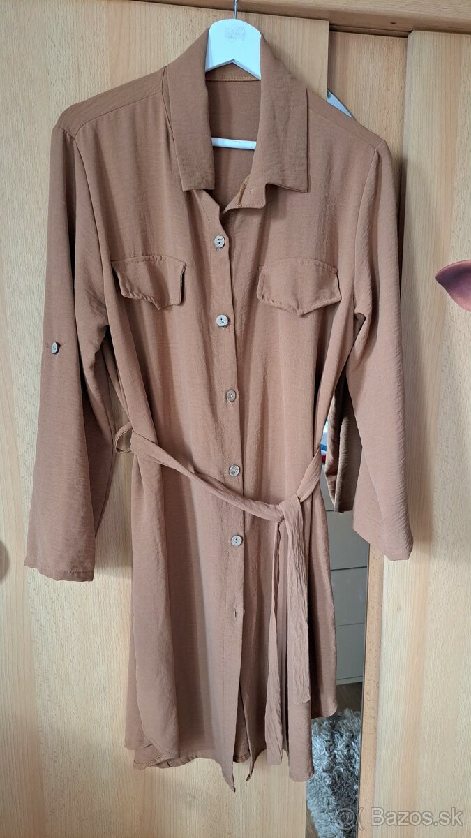 Košeľové šaty marhuľovej farby - [4.3. 2026]Predám jemné košeľové šaty na bežne nosenie i príležitosť. V páse je gumičku, ktorá pekne tvaruje postavu. Veľkosť 38. Rozmery pod pazuchami 43 cm, dĺžka 94 cm