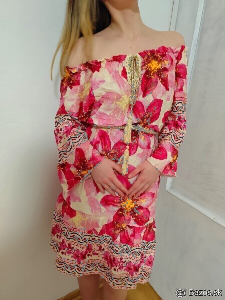 Nové lahke, letne, viskozove šaty na španielku, z eshopu, sadne po prsia 120 cm, cd 105 cm za 16€.na foto su oblecene na velkosti S s opaskom (ten nie je sucastou, aby ste videli ako vyzeraju s opaskom, aj bez)