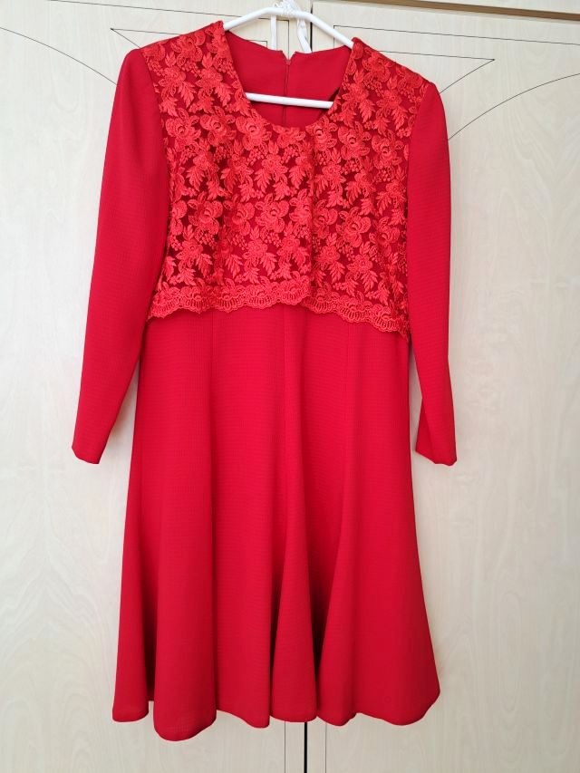 Predám dámske spoločenské šaty s dlhým rukávom, veľ. písaná 40 ale zodpovedajú veľkosti 38. Šaty majú strih do A, majú dĺžku do polovice kolien (pri mojej výške 160 cm). Sú z kvalitného materiálu, zapínanie v zadnej časti šiat je na zips, boli oblečené 1x na svadbe. Majú krásnu červenú farbu. Celková dĺžka šiat je 97 cm, v páse 40 cm x 2. Cena 60 eur + pošta (PC 120 ,- eur). Na dobierku nezasielam, platba vopred na účet alebo osobný odber.