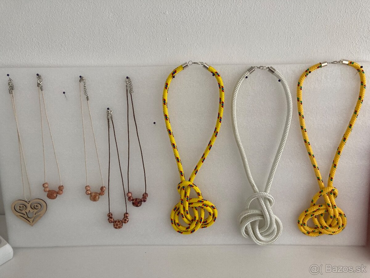 Predám ručne vyrobené náhrdelníky, pozri foto, rôzny materiál - drevo, lano a pod. Cena za kus 5€ plus poštovné. Aktualizácia - v ponuke už len lanové náhrdelníky. Dohoda možná.