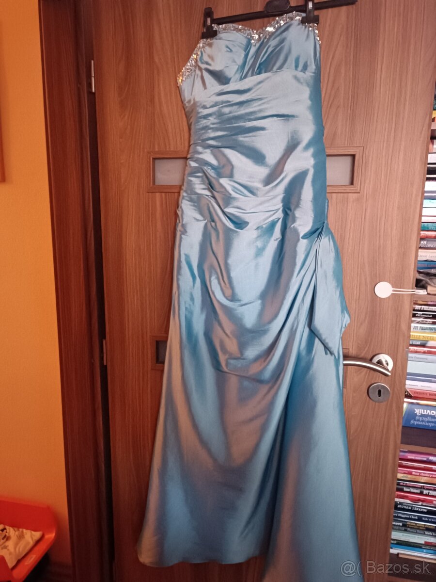 Super stav, 1 x oblecene, krasna modra farba, dekolt zdobeny kamienkami, jedna cast sa zapina okolo krku, druha cast sa zapina na tri male cvoky na chrbte. Vhodne na stihlu, vysoku postavu min.170 cm, satén, zn.DYLAN QUEEN.