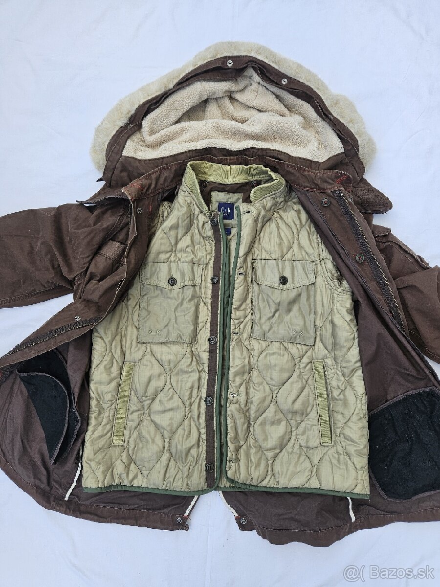 Tmavohnedý kabát GAP 3in1 vo veľkosti L/G s kapucňou. Kabát má odopínateľnú vnútornú bundu, ktorá slúži v zime ako podšívka a v prechodnom období ako ľahká bunda. Samostatne sa dá nosiť aj kabát bez vnútornej bundy. Veľmi dobrý stav. Jediná chybička je chýbajúca šnúrka, ktorú nie je problém dokúpiť v galantérii.
