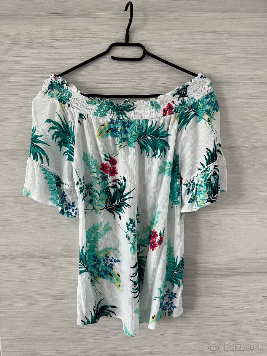 Tričko je vyrobené z príjemného materiálu, má letný vzor a odhalené ramená, čo ho robí ideálnym na teplé letné dni.