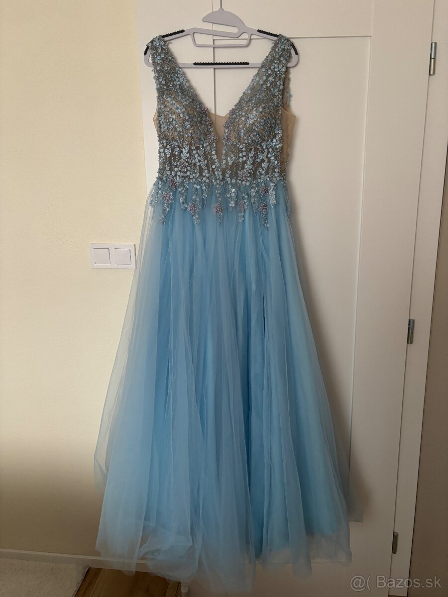 Svetlomodré spoločenské šaty, M - [26.3. 2026]Svetlomodré spoločenské šaty, M. Na výšku 163cm už s topánkami. Cena 100 eur.