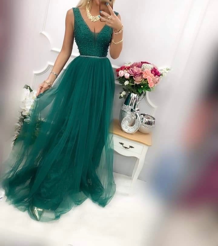 Buď kráľovnou plesu! V týchto dlhých zelených šatách Vás zaručene nikto neprehliadne. Trblietavý vrch šiat s véčkovým výstrihom vpredu aj na chrbte je doplnený zelenými perličkami. Jemný pásik v drieku je ozdobený perličkami a kamienkami. Trblietavú sukňu zakrýva jemná vrstva tylu. Zapínanie na chrbte pomocou zipsu.