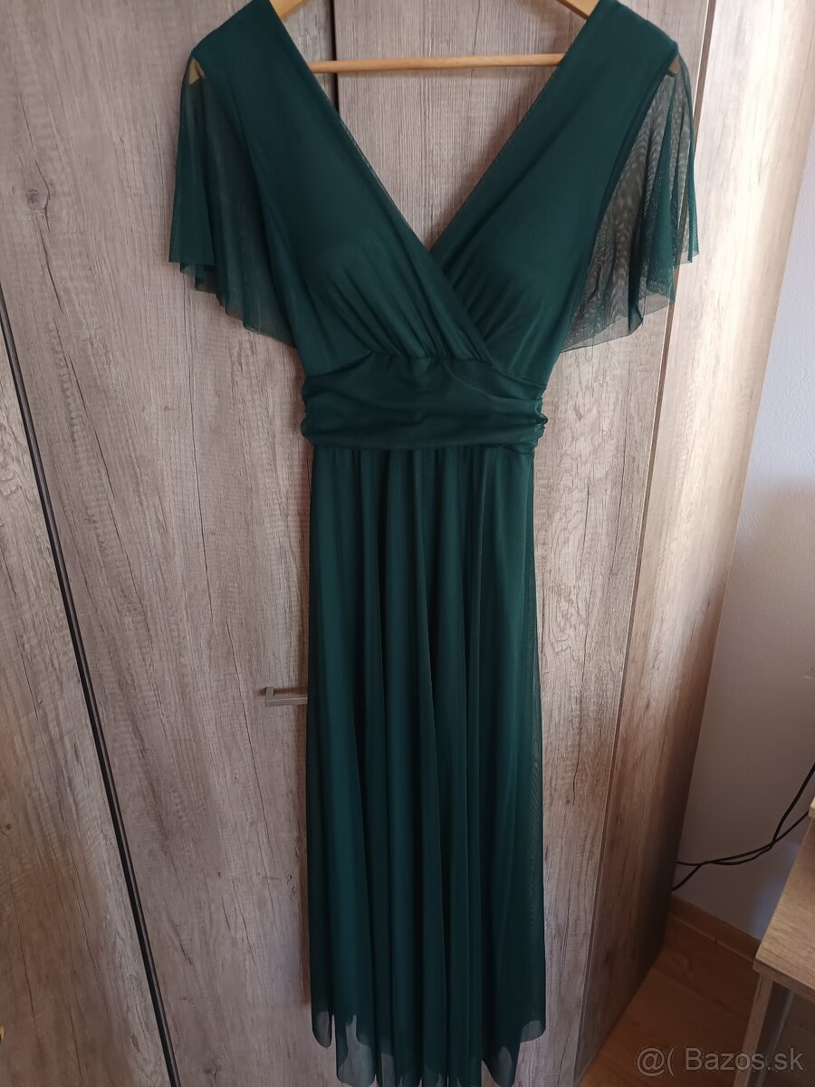 Smaragdové spoločenské šaty veľkosti M. Oblečené iba raz na stužkovej. V oblasti pásu je samostatne nastaviteľný opasok, ktorý je vzadu riešený viazaním. Šaty majú vystužené košíčky. Šaty sú v výbornom stave, bez poškodenia. Možný aj osobný odber Prešov.