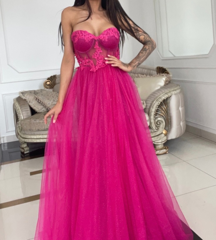 Nádherné cyklámenové luxusné tylové spoločenské šaty s nádherným prepracovaným vrchom. Sukňa šiat je tylová, bohatá zdobená striebornými trblietkami. Šaty sa zapínajú na zips