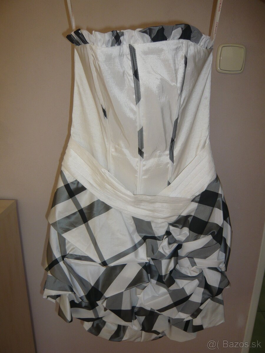 Biele spoločenské šaty Strada (kúpené v Beatrixe). Veľkosť 34. Dĺžka vpredu 73 cm, vzadu 78 cm. Obvod pása 64 cm. 2-krát oblečené. K šatám patrí ešte brošňa, ktorú som z nich zatiaľ odopla, aby sa neporušili. Darujem k nim čiernu štólu cez plecia. Pôvodná cena 80 €. V prípade vážneho záujmu môžem poslať foto oblečené.