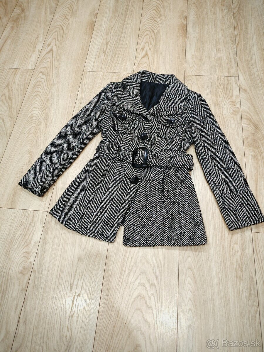 Krásny čiernobiely kabát s podšívkou, má funkčné vrecká, opasok je súčasťou, zapínanie na gombíky, veľkosť S.